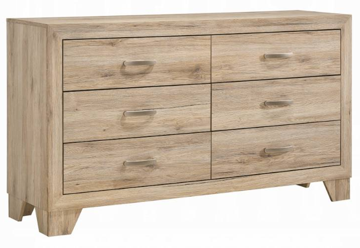 The Miquell bedroom collection provides a commanding presence in any bedroom. This transitional dresser features glides, dovetail english front and back, safety stops, and manual closing.