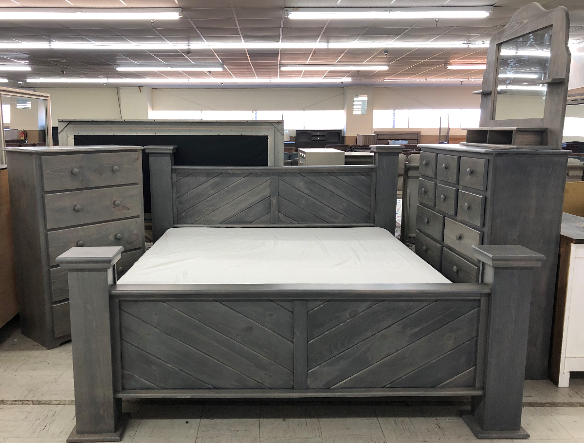 Make a statement with this bold yet classic bedroom set. With its clean lines and solid wood construction, The Mansion Collection will be sure to please. Gunsmoke gray finish. Solid wood. Made in America. BED ONLY. Bed includes headboard, footboard, and side rails. Bed may be purchased in matching bedroom set. AVAILABILITY VARIES DAILY.Read More