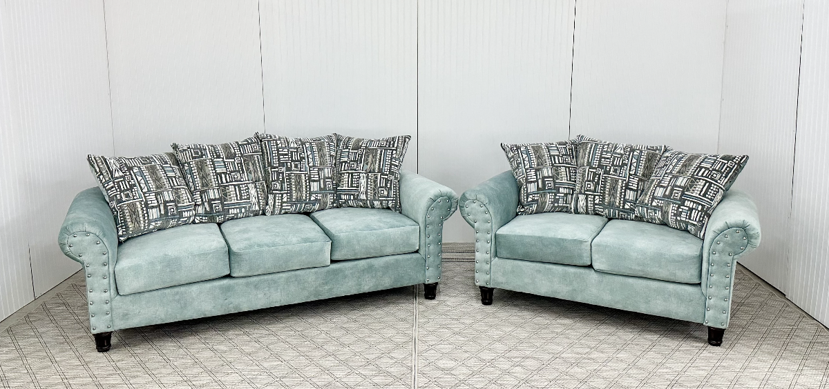 Upholstered loveseat and sofa in teal with nail head trim and gray accents. Loveseat and sofa sold in a set only. AVAILABILITY VARIES DAILY.Read More