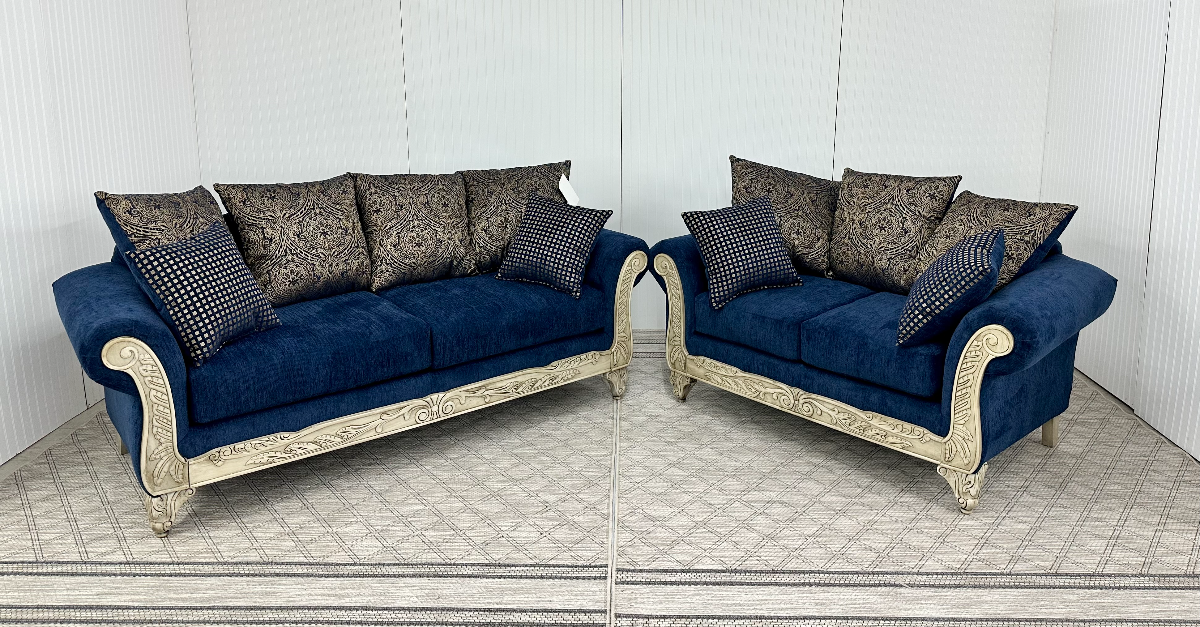 Upholstered sofa and loveseat set in navy with beige and gold accents. Sofa and loveseat sold in set only. AVAILABILITY VARIES DAILY.Read More