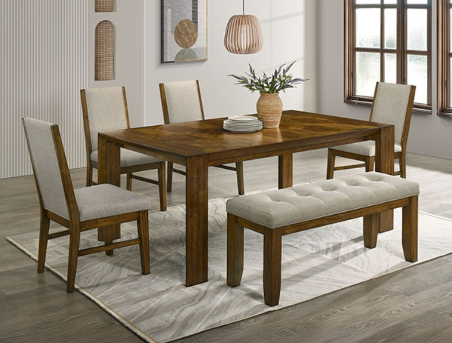 Create a warm, inviting table with this dining set. The tailored chairs are upholstered in a soft neutral fabric, providing luxurious comfort and a modern touch. The table emphasizes the beauty of the natural material while adding a sophisticated and dynamic touch to the set. The matching bench adds flair, completing the set. Set includes table, four chairs, and matching bench. Sold as set only. AVAILABILITY VARIES DAILY.Read More