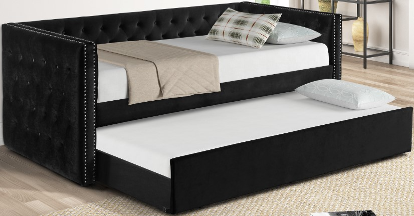 Sleep in style with the Crown Mark Trina Daybed, a stunning and versatile addition to any modern home. The sleek black finish of the daybed is perfectly complemented by the elegant tufting pattern and accent nailhead trim, creating a sense of sophistication that's perfect for any interior décor. AVAILABILITY VARIES DAILY.Read More