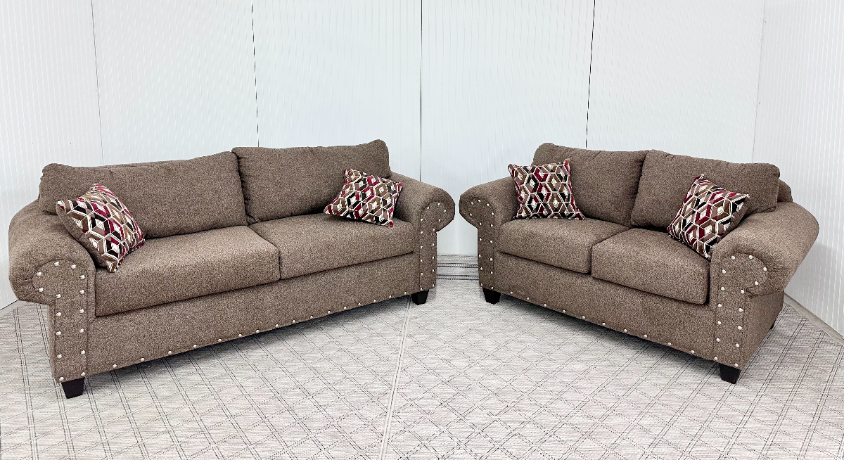 Sofa and loveseat set that fits your lifestyle and your budget! You'll love the comfort and versatility of this living room set. The sofa and loveseat boast nail head trim and clean, curved lines. This set will be the gathering place of choice in no time. Sofa and loveseat sold as a set only. AVAILABILITY VARIES DAILY.Read More