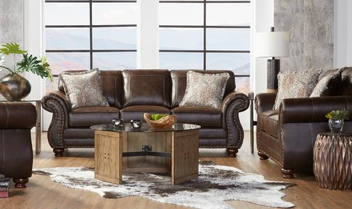 The 17400 sofa blends traditional lodge character with long-lasting comfort. Upholstered in rich leather-look Whaler Bronze fabric, it features antique gold nailhead trim, top-stitched loose-back cushions, and welt detailing. Built on a hardwood frame with sinuous-spring support, it's ideal for high-traffic living rooms or family dens. AVAILABILITY VARIES DAILY.Read More