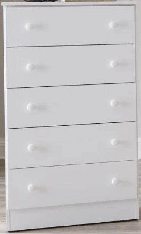 Kith Bedroom Chest-White with knob handles and five drawers. AVAILABILITY VARIES DAILY.Read More