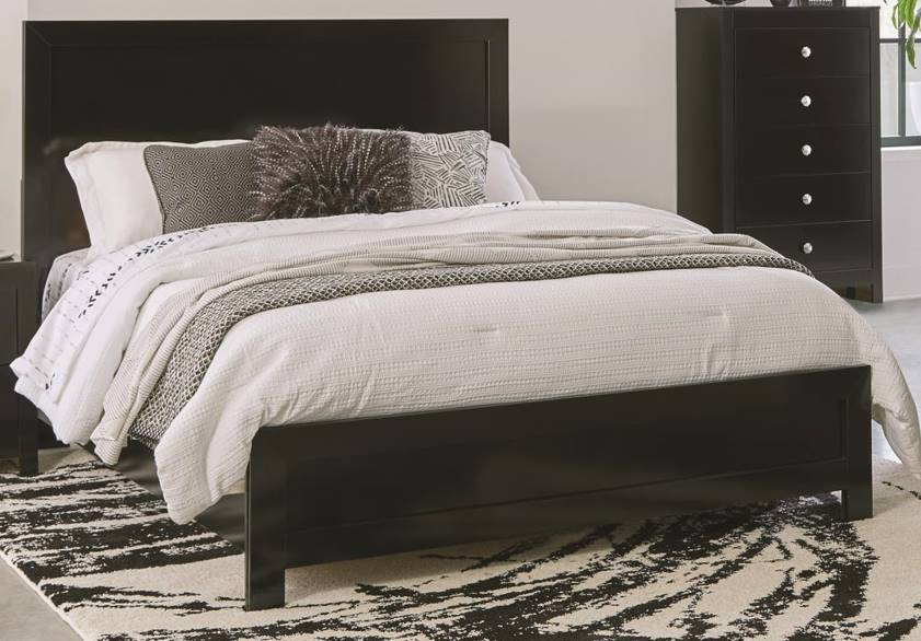 The 430 Breanne Queen bed features panel style, clean lines and a black finish. AVAILABILITY VARIES DAILY. Bed set (headboard, footboard, and side rails) also available in matching bedroom set. Bedroom set include bed (headboard, footboard, and side rails), dresser with mirror, chest, and nightstand.Read More