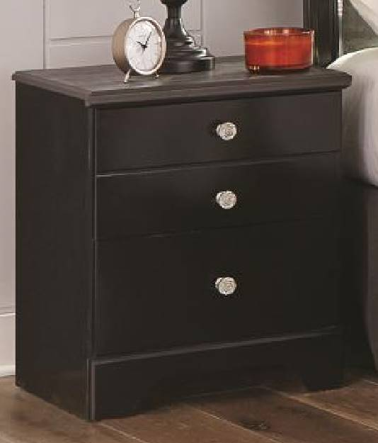 Kaylynn Nightstand features 3 drawers, clean lines, and a small footprint. NIGHTSTAND ONLY. Available in matching bedroom set. Set includes headboard, dresser with mirror, chest, and nightstand. AVAILABILITY VARIES DAILY.Read More