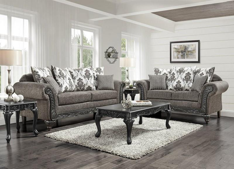 Sofa and loveseat set that fits your lifestyle and your budget! Enjoy the sophistication and comfort of this sofa and loveseat. This traditional set will be the feature of your gathering space as you entertain family and friends. The set features wood trim, pleated rolled arms, carved wood legs, and soft chenille fabric. Sofa and loveseat sold as a set only. AVAILABILITY VARIES DAILY.Read More