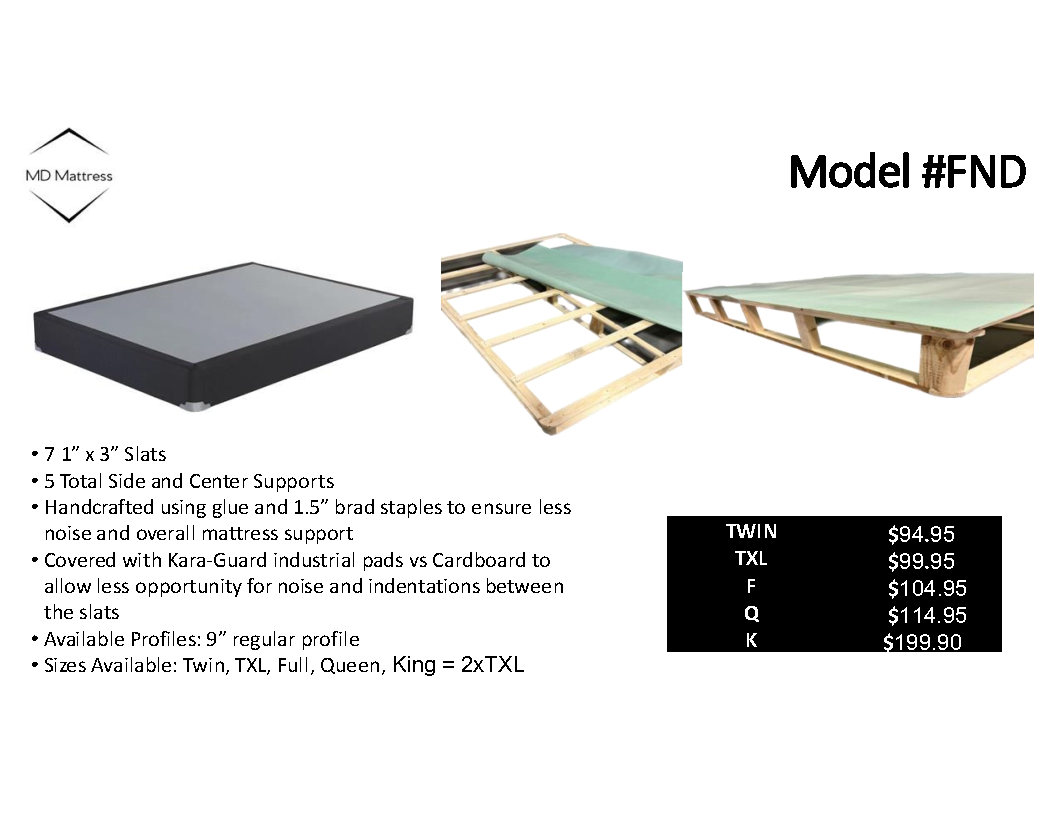 King 9" Foundation. Handcrafted to ensure less noise and overall mattress support. Covered with Kara-Guard to allow less opportunity for noise and indentations between slats. PLEASE NOTE: Two foundation pieces needed to support king mattress ($199.90 for both pieces). AVAILABILITY VARIES DAILY.Read More