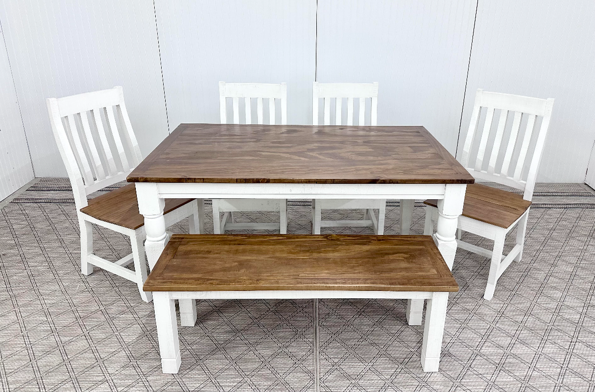 Gather and linger around this beautiful 5 foot table. With its 4 matching chairs and convenient bench, you will have room for the whole crowd. Solid wood construction means this will the gathering spot for some time to come. Set includes table, 4 chairs, and matching bench. AVAILABILITY VARIES DAILY.Read More