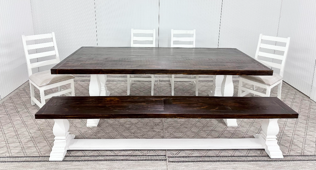 Elevate your space with the 8 foot Pine Island Dining Table Set, an exquisite blend of opulence and charm. Crafted with utmost precision, this stunning piece features a weathered white color that exudes timeless elegance, making it a must-have statement for any sophisticated interior. Set includes 8 foot table, 4 chairs, and matching bench. AVAILABILITY VARIES DAILY.Read More