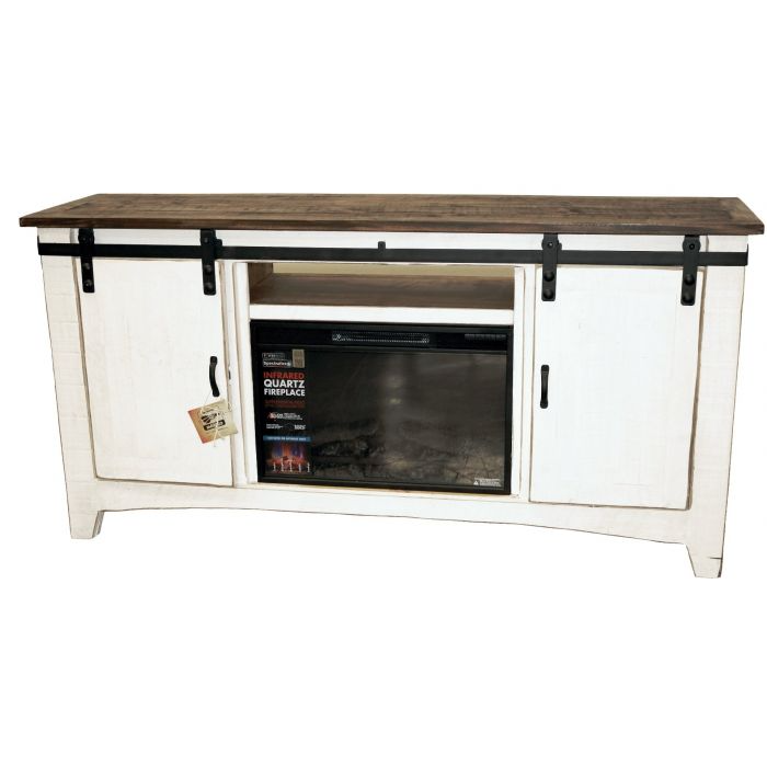 Gather round the fireplace to watch the game with this cozy yet functional living room piece. Solid wood. Fireplace insert is all LED electric. 2 sliding barn doors with 2 classic wire doors. Dark brown over white barn wood. TV stand and fireplace insert sold as a set only. TV Stand and fireplace insert. AVAILABILITY VARIES DAILY.Read More