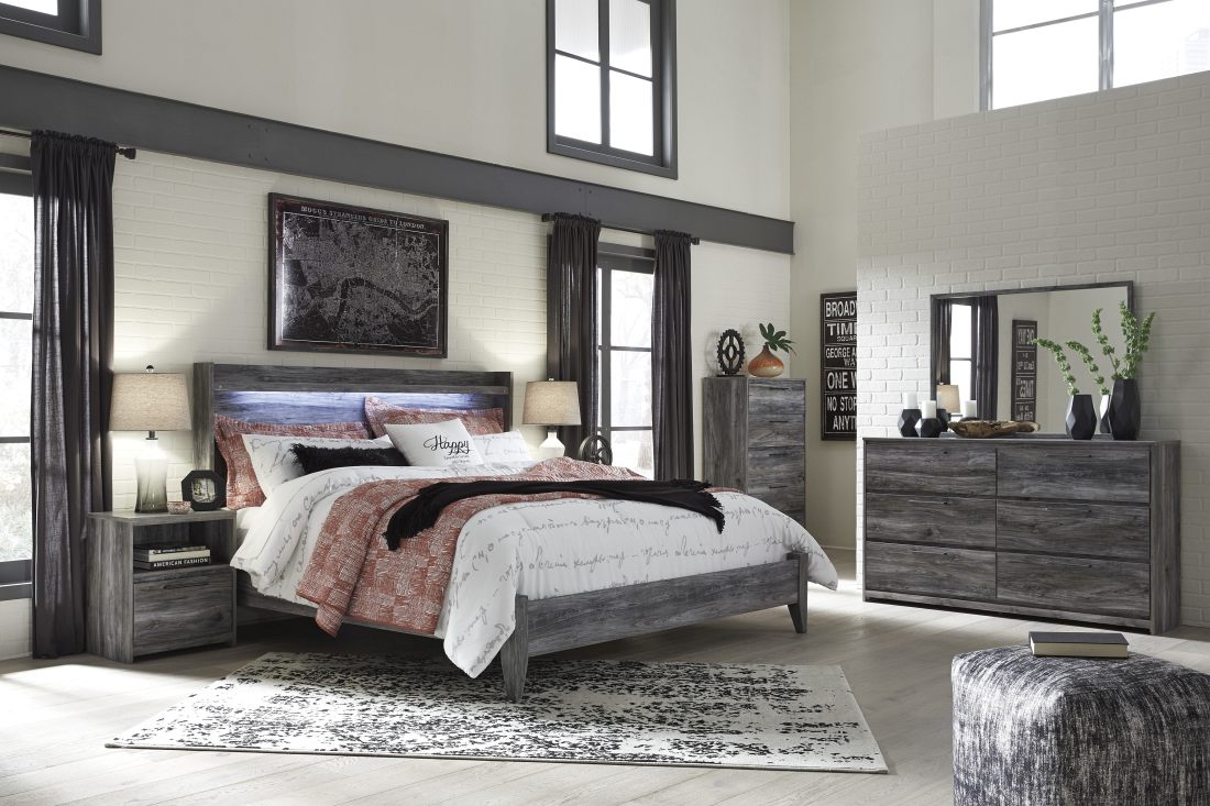 Establish the feel of cozy seaside cottages in your bedroom with the Baystorm collection from Signature Design by Ashley®. The replicated oak grain materials provide a distinctly rustic, driftwood feel that seamlessly accents your home’s style. Drift away to your own waterfront getaway with this stormy-gray collection.