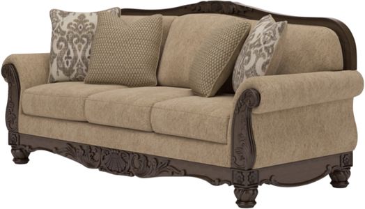 This sofa is a gorgeous example of new traditional design. Its elegant profile and plush cushions merge classic flair with modern comfort. Golden high-luster textured upholstery sets the tone for an easy elegant look, while carved details and decorative turned legs make a grand statement. AVAILABILITY VARIES DAILY.Read More