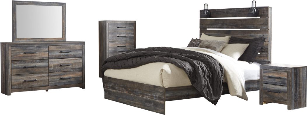 Rustic and industrial styles can create a happy marriage when combined in the correct manner. Case in point: The Drystan Bedroom Set. Bedroom set includes bed (headboard, footboard, side rails), dresser with mirror, nightstand, and chest. AVAILABILITY VARIES DAILY.Read More