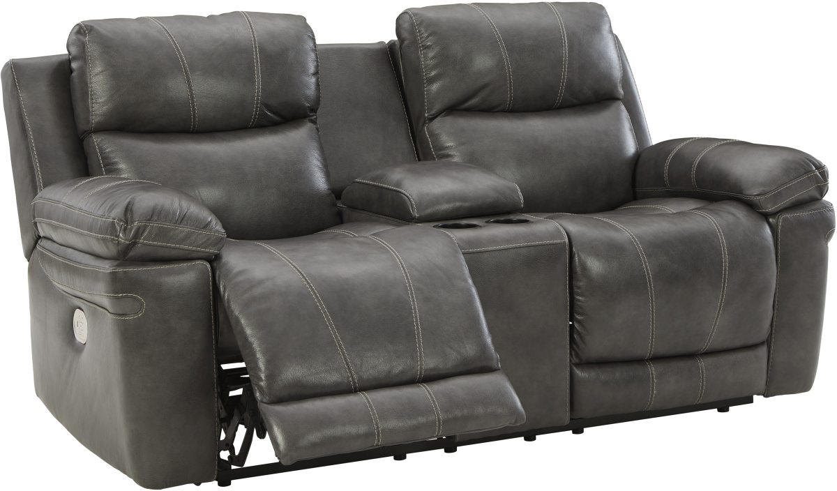 Frame constructions have been rigorously tested to simulate the home and transportation environments for improved durability. Frame components are secured with combinations of glue, blocks, interlocking panels and staples. Stripes and patterns are match cut. All fabrics are pre-approved for wearability and durability against AHFA standards. Cushions are constructed of low melt fiber wrapped over high quality foam. Features metal drop-in unitized seat box for strength and durability. The power reclining mechanism features infinite positions for comfort and a USB charging port in the controls. In addition, the style features a power adjustable head rest. Leather Match upholstery features top-grain leather in the seating areas with skillfully matched vinyl everywhere else. Style features a console with storage and two cup holders.