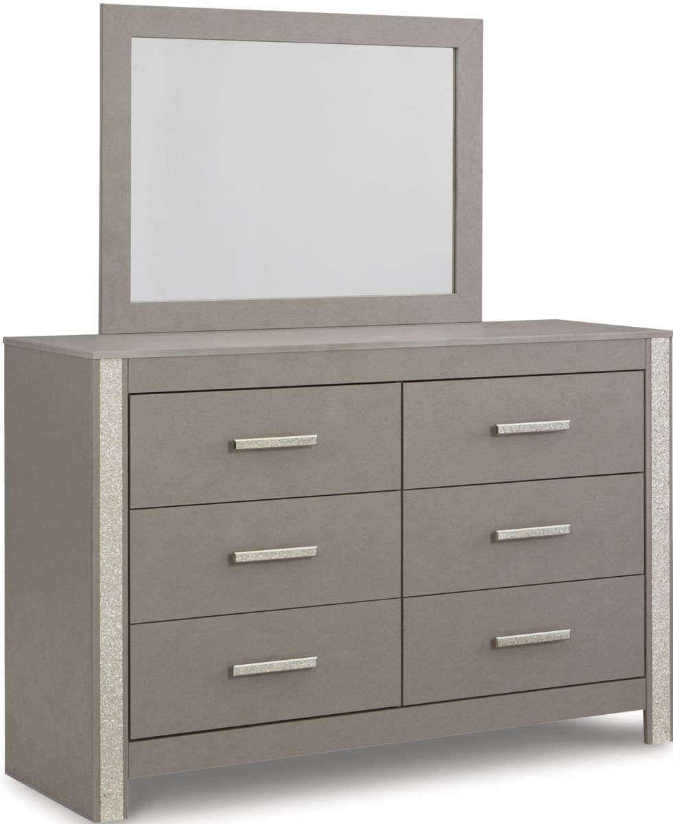 Love sleek and bold contemporary style? Drink in the beauty of this dresser with mirror. Its eye-catching details include glam glitter accents and the look of leather grain with a subtle gray finish. Large-scale linear handles, in a sophisticated champagne chrome tone, play perfectly with the streamlined aesthetic. Dresser with mirror may be purchased in matching bedroom set. AVAILABILITY VARIES DAILY.Read More