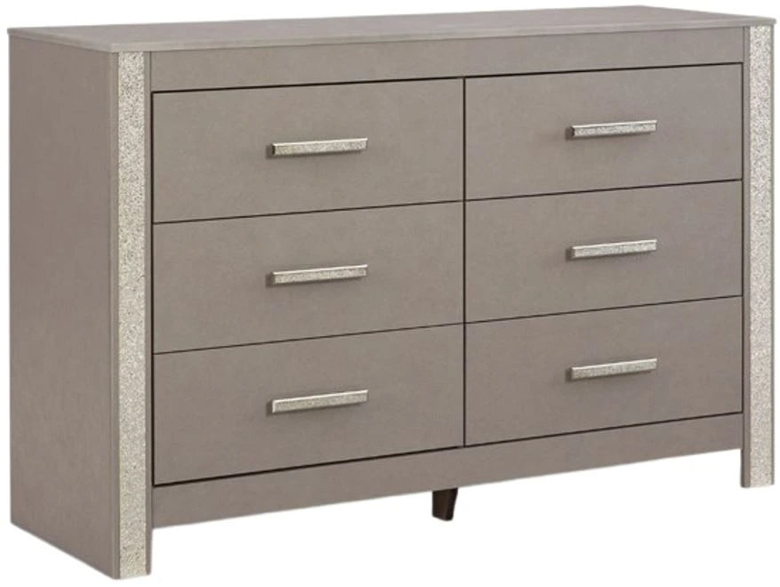 Love sleek and bold contemporary style? Drink in the beauty of this dresser. Its eye-catching details include glam glitter accents and the look of leather grain with a subtle gray finish. Dresser also sold with matching bedroom set. AVAILABILITY VARIES DAILY.Read More
