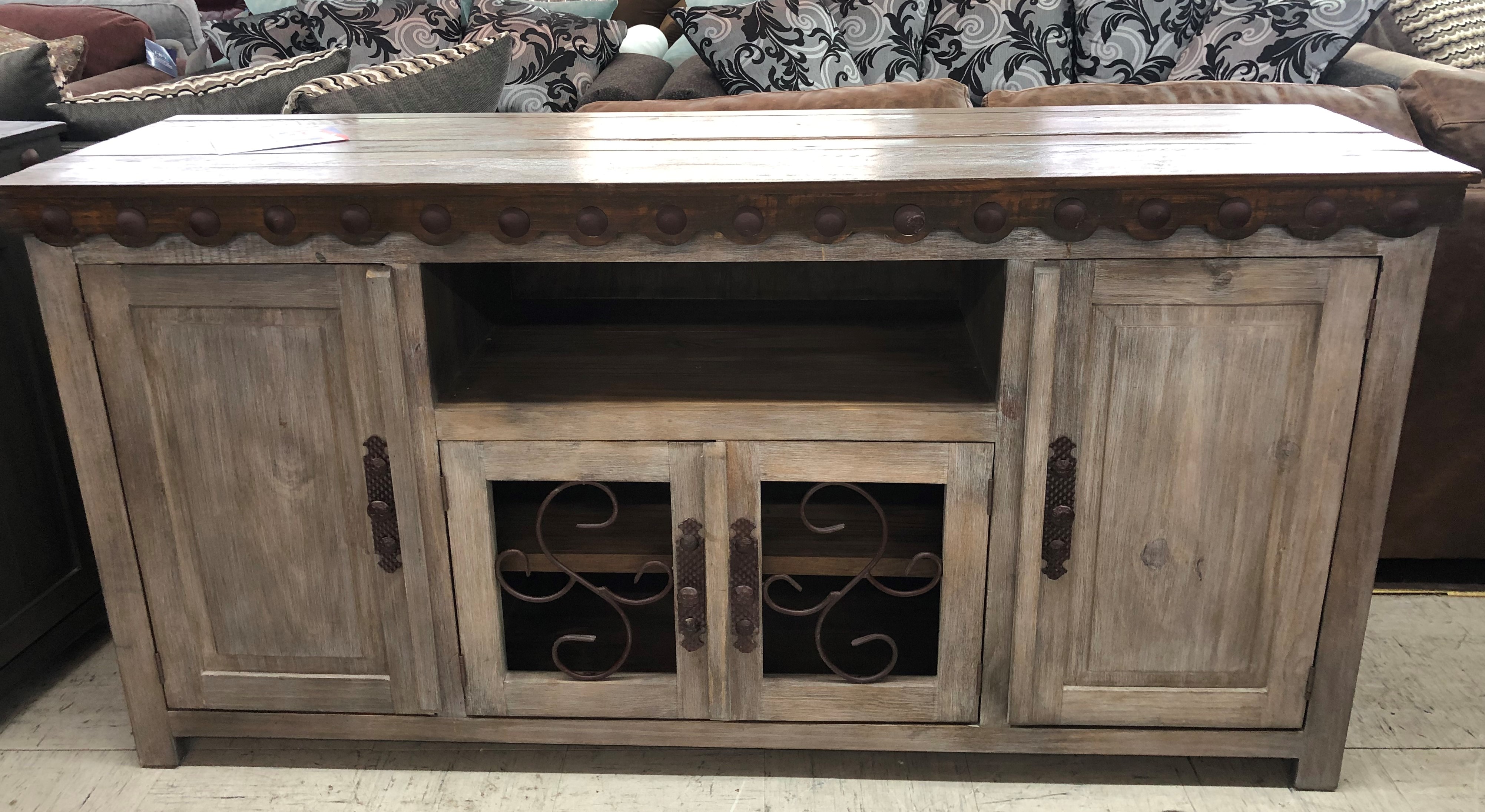 You'll find delight in the details of this beautiful yet functional TV stand. Large decorative nailheads frame this piece while 2 scrolled doors provide eye-catching appeal. Solid wood. Dark brown over barn wood finish. AVAILABILITY VARIES DAILY.Read More