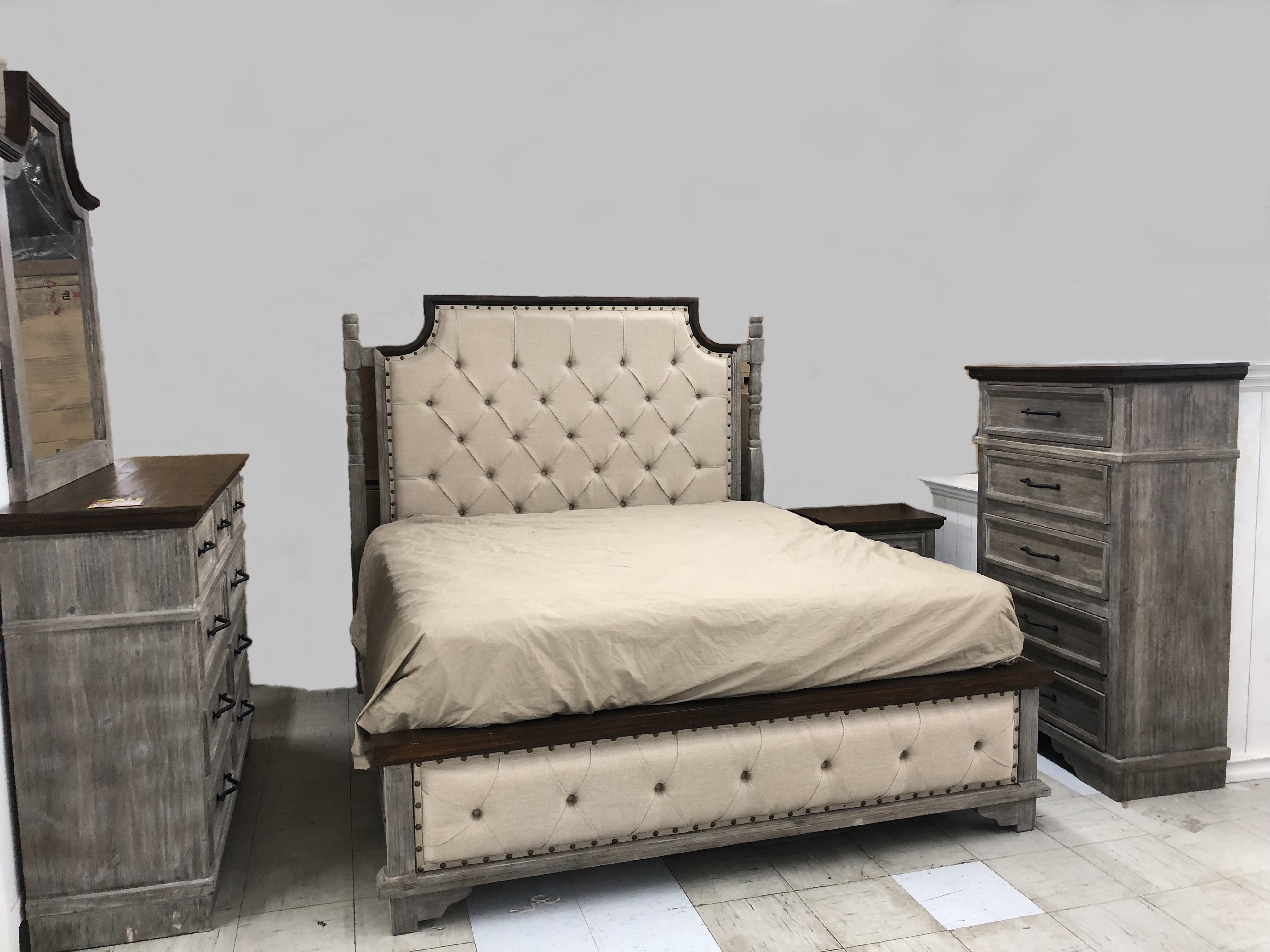 Stately elegance meets rugged appeal in this bedroom set with tufted headboard and footboard. Solid wood. Dark brown over barnwood. QUEEN BED only. Sold in bed set only. Bed set includes headboard, footboard, side rails, and slats. AVAILABILITY VARIES DAILY.Read More
