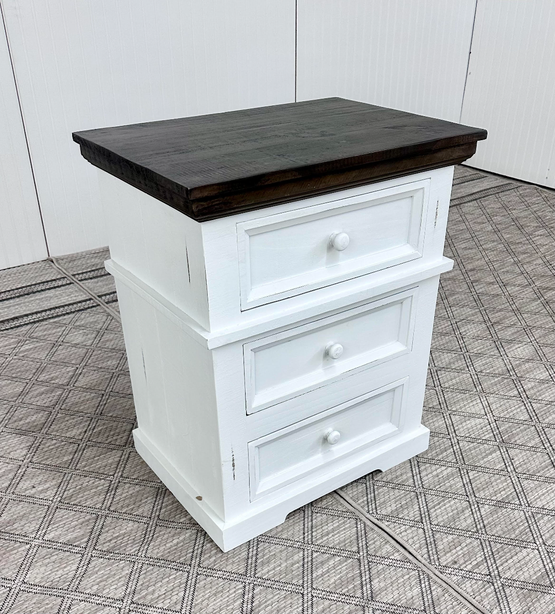 Solid wood. 3-drawer nightstand. Old Texas brown over rubbed white. AVAILABILITY VARIES DAILY.Read More