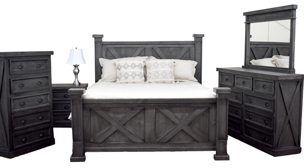 Escape to the coziness of a mountain-top chalet with this bold yet beautiful bedroom set. Set includes bed (headboard, footboard, side rails, and slats), chest, dresser with mirror, and nightstand. Dark gray lacquered finish. Solid wood. SOLD AS A SET ONLY. AVAILABILITY VARIES DAILY.Read More