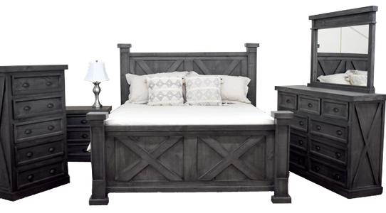Escape to the coziness of a mountain-top chalet with this bold yet beautiful bedroom set. Set includes bed (headboard, footboard, side rails/SLATS), dresser with mirror, chest, and nightstand. Dark grey lacquered finish. Solid wood. SOLD AS A SET ONLY. AVAILABILITY VARIES DAILY.Read More