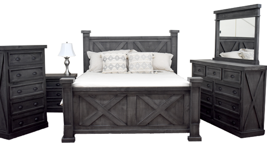 Escape to the coziness of a mountain-top chalet with this bold yet beautiful bedroom set. Set includes queen bed (headboard, footboard, side rails, and slats), dresser with mirror, chest, and nightstand. Dark grey lacquered finish. Solid wood. AVAILABILITY VARIES DAILY.Read More