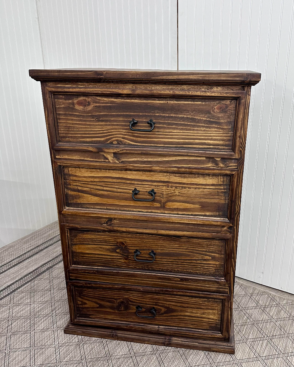 Solid wood. 4-drawer chest of drawers. Dark brown. Antique waxed. CHEST ONLY. Chest may also be purchased in bedroom set. Bedroom set includes bed (headboard, footboard, side rails, and slats), dresser with mirror, chest, and nightstand. AVAILABILITY VARIES DAILY.Read More