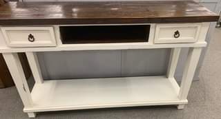 Farmhouse ready! Complete your living area with this rustic accent piece. Solid wood. Dark wood over antique white. AVAILABILITY VARIES DAILY.Read More